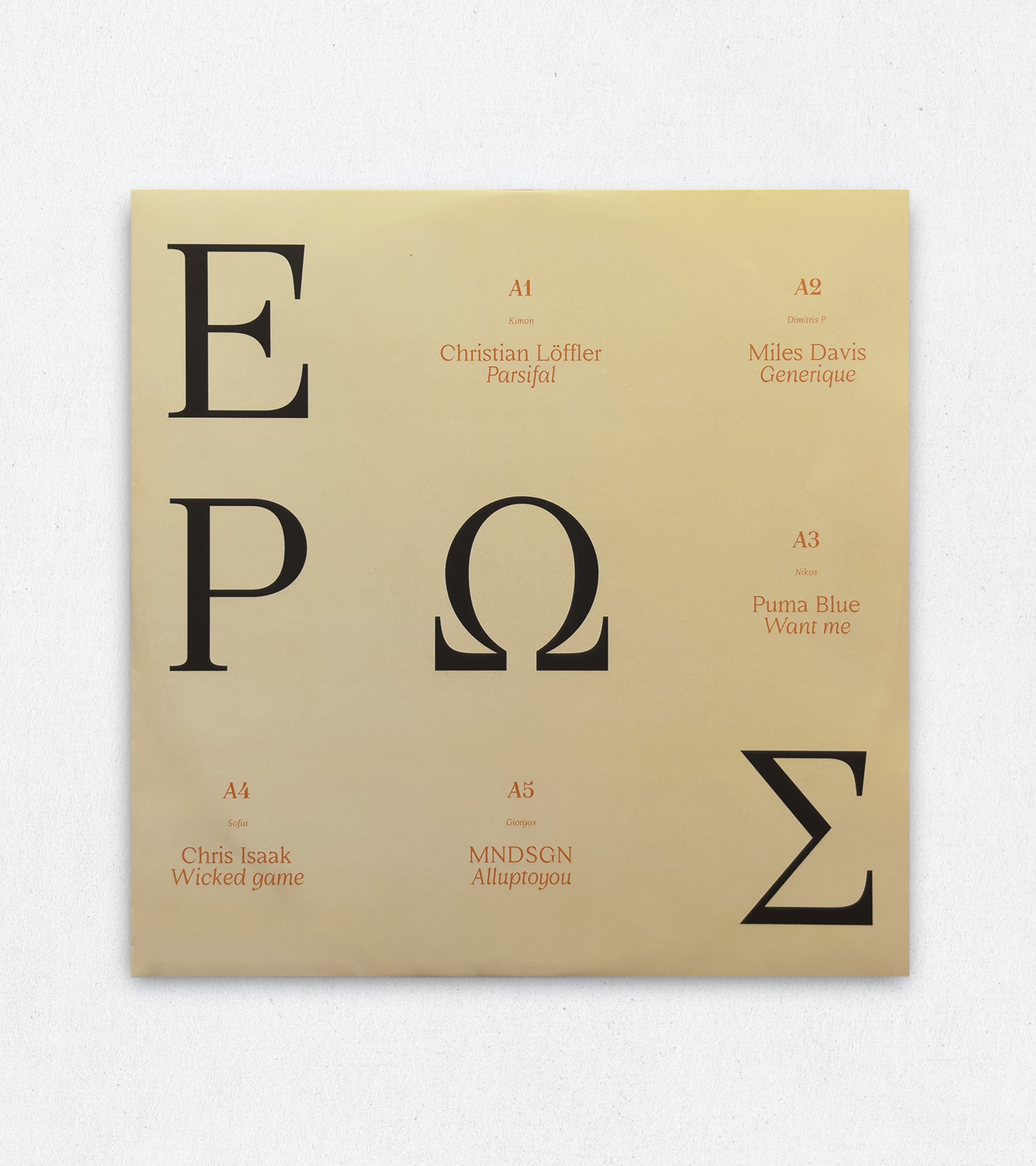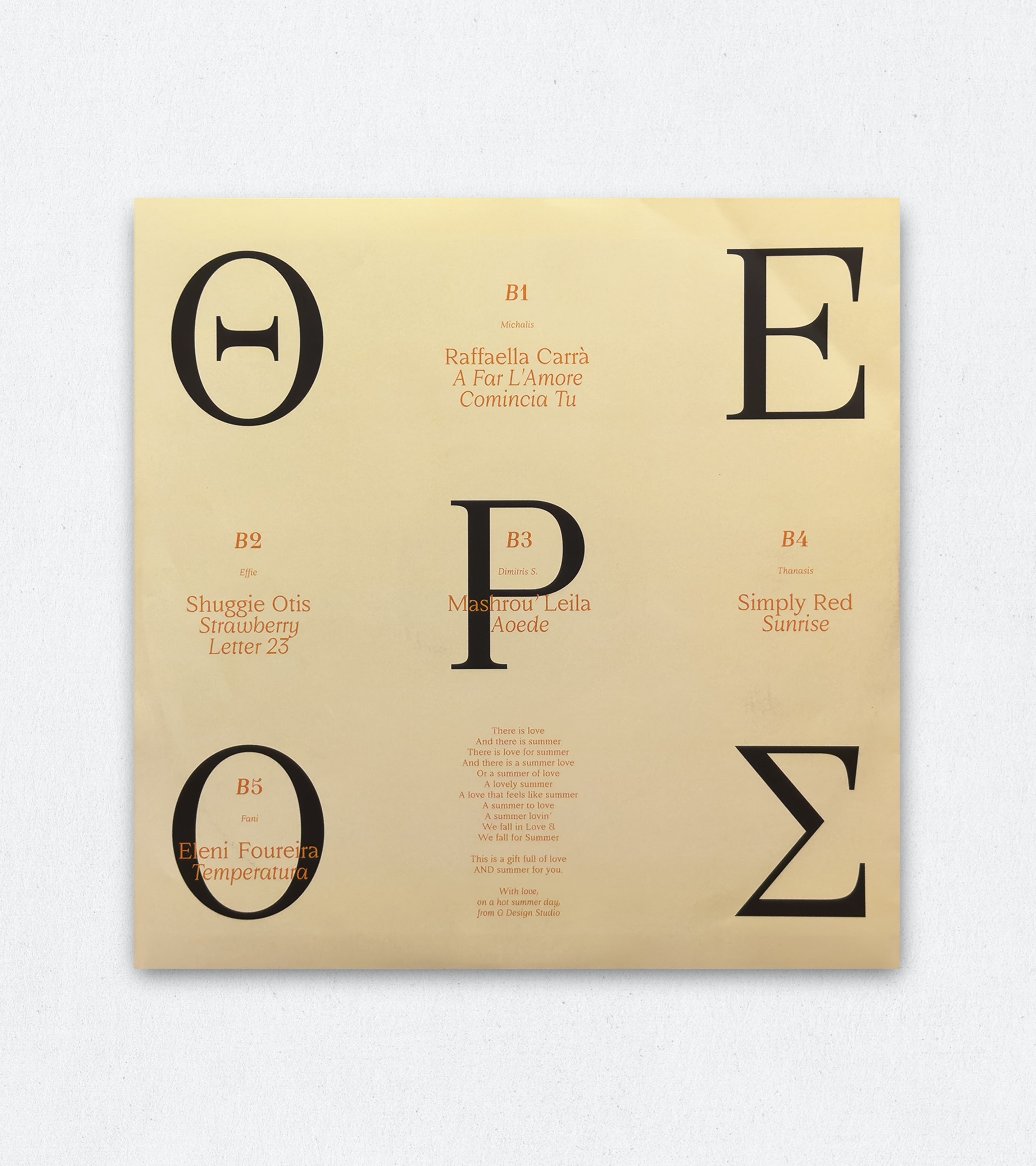 Conceived as a dual concept, Eros (love) Theros (summer) explores the themes of love and summer as a state of mind where they coexist and mirror each other through rhythm, pace and emotion. Music became the medium to translate this burning relationship, resulting in a curated playlist pressed on transparent vinyl, produced in Athens and released as a limited seasonal gift. Each side of the record features selections by different members of the team, forming a spontaneous, collective narrative.